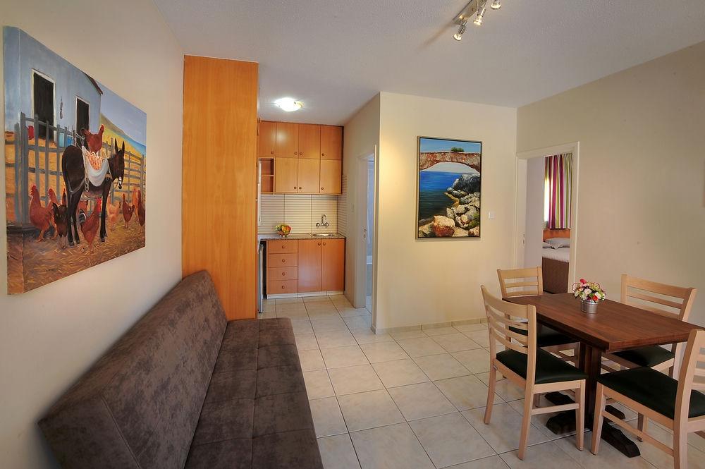 Szobák: minden standard szoba praktikusan és kényelmesen berendezett, egy hálószobás (~20 m2), légkondicionált, fürdőszobás, hajszárítóval, síkképernyős tv-vel, vízforralóval (kávé és teafőzési lehetőség) és telefonnal felszerelt. A stúdió szobákban egy kis konyhasarok is található. A családi szoba (~25 m2), hasonlóan felszerelt, tágasabb lakóteret kínál több személy kényelmesen elhelyezéséhez, a szobában két ágy egy kis társalgó rész (pótágyként dívány) található. Az 1 hálószobás apartmanok a családi szobával hasonló kialakításúak és felszereltségűek, azonban két különálló helyiséggel rendelkeznek (hálószoba és nappali), a nappaliban kis konyhasarok is található. Minden szobához erkély tartozik utcai, medencére vagy oldal tengerre néző kilátással. Széf és minihűtő térítés ellenében a helyszínen bérelhető.